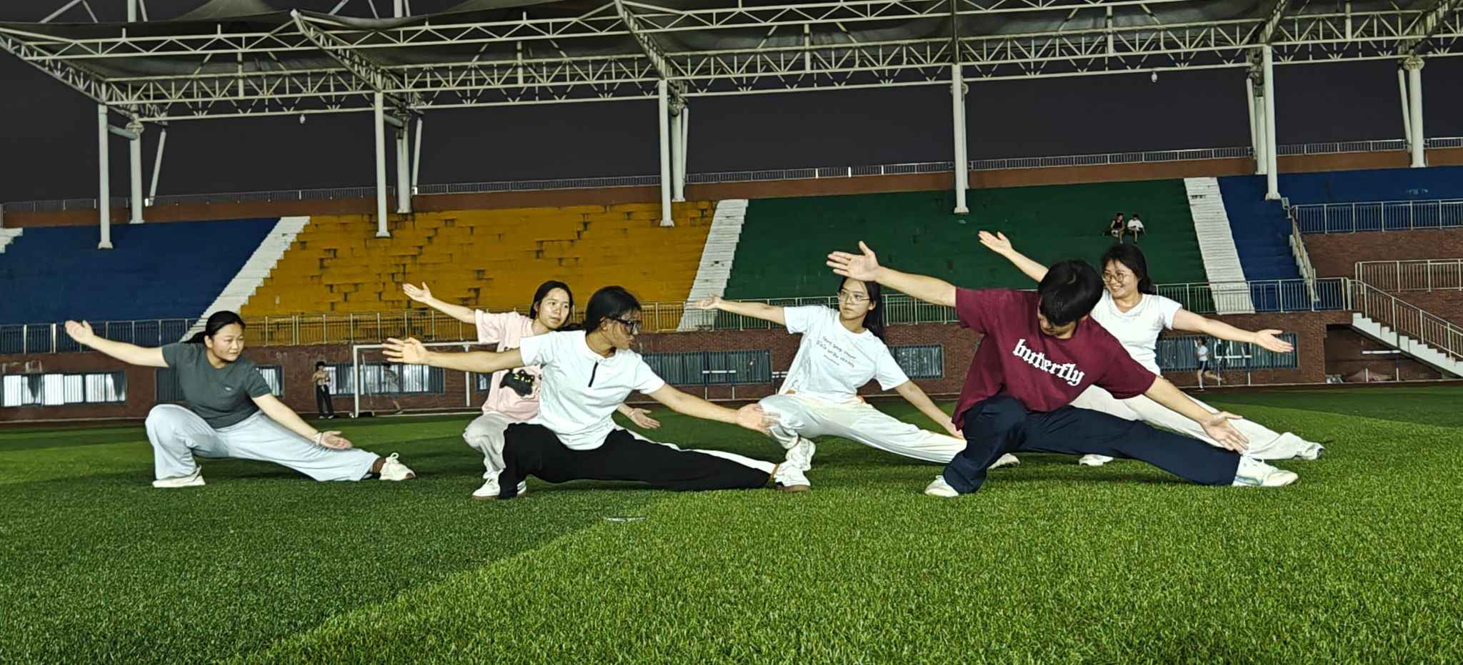 夏夜繁星闪烁,操场灯火通明,松园田径场化身为武术课堂。本次武术夜校教练团队由武术协会员工组成,结合趣味教学法,将八段锦的舒缓柔美与五步拳的刚劲利落融入课程,通过口诀记忆、分组比拼等方式,让零基础学员快速掌握动作要领。活动过程还融入健身知识科普、运动损伤防护技巧等内容,帮助学员们科学锻炼。训练过程中,学员们手持夜光器械,一招一式在灯光下整齐划一,展现出学习武术的顽强精气神,成为校园独特的文化风景线。“从手脚不协调到能完整打出套路,武术让我变得更自信!”许多学员因此次武术夜校结缘,组建起“夜练小分队”,发挥交流平台作用。