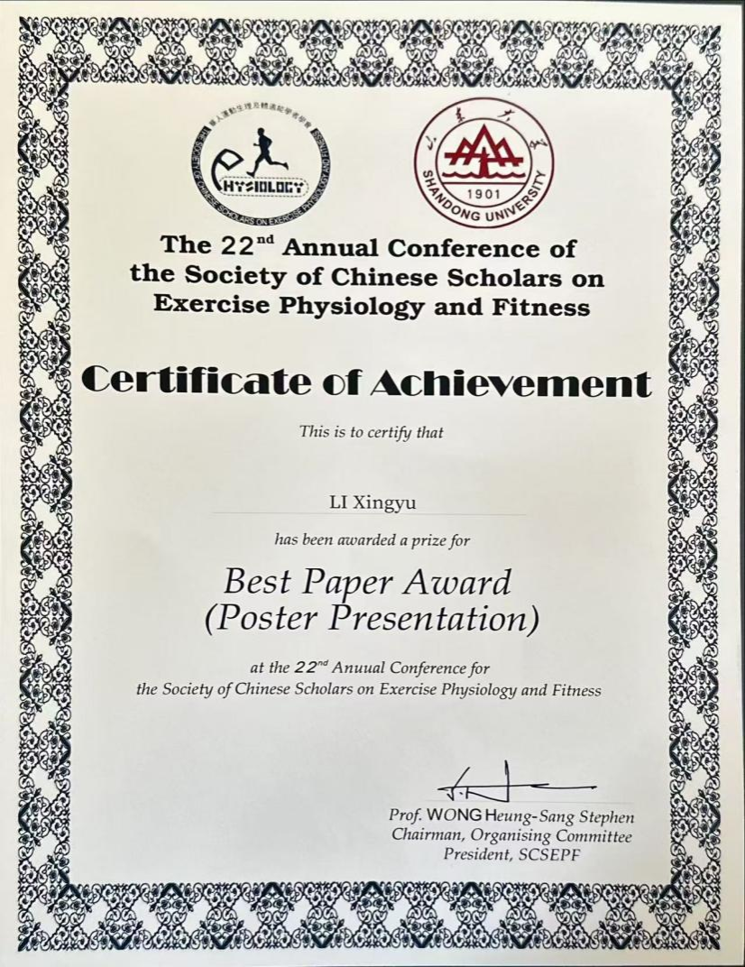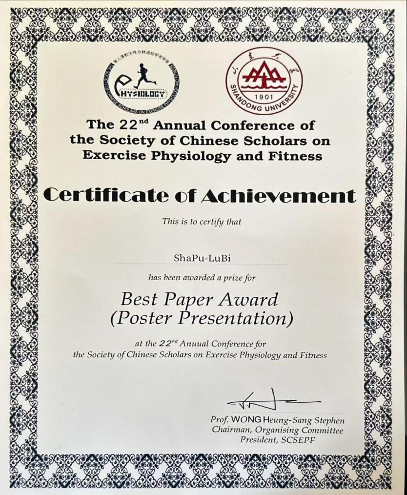 9月19日至21日,2025年第二十二届华人运动生理与体适能学者学会年会暨学术大会在山东大学(青岛)成功召开。本次会议以“数智赋能运动健身与竞技体育(Digital Intelligence Empowers Physical Fitness and Competitive Sports)”为主题,吸引了来自海内外300余位运动生理与体适能领域的专家学者、青年科研人员与会交流。公司师生积极参与并表现突出,沙部·鲁比博士与2024级体育硕士研究生李兴雨分别荣获“优秀论文奖”。