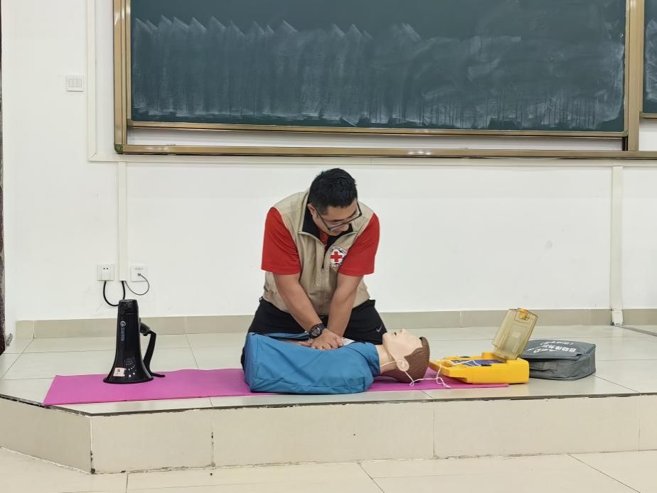 随后,沙部博士向师生详细示范了CPR+AED操作流程,又分步骤、慢动作操作演示如何调整体位、打开气道、判断呼吸、人工呼吸、胸外心脏按压等急救法,并邀请同学进行现场模拟操作,现场互动气氛积极活跃。