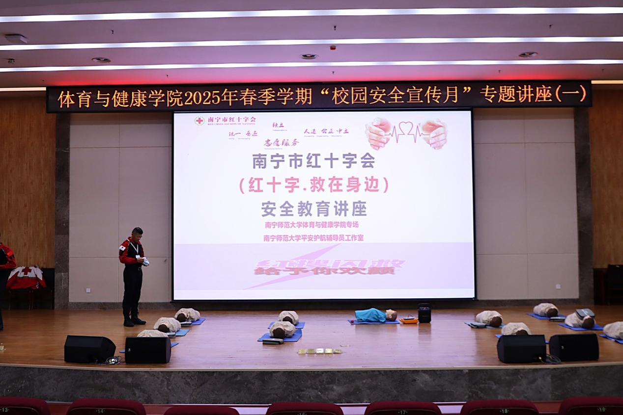 经理助理马泓宇宣布学院“校园安全宣传月”正式启动后,由南宁市红十字会苏耀彬、胡华民两位老师开展“校园安全宣传月”专题讲座,讲座主题为“红十字:救在身边”。